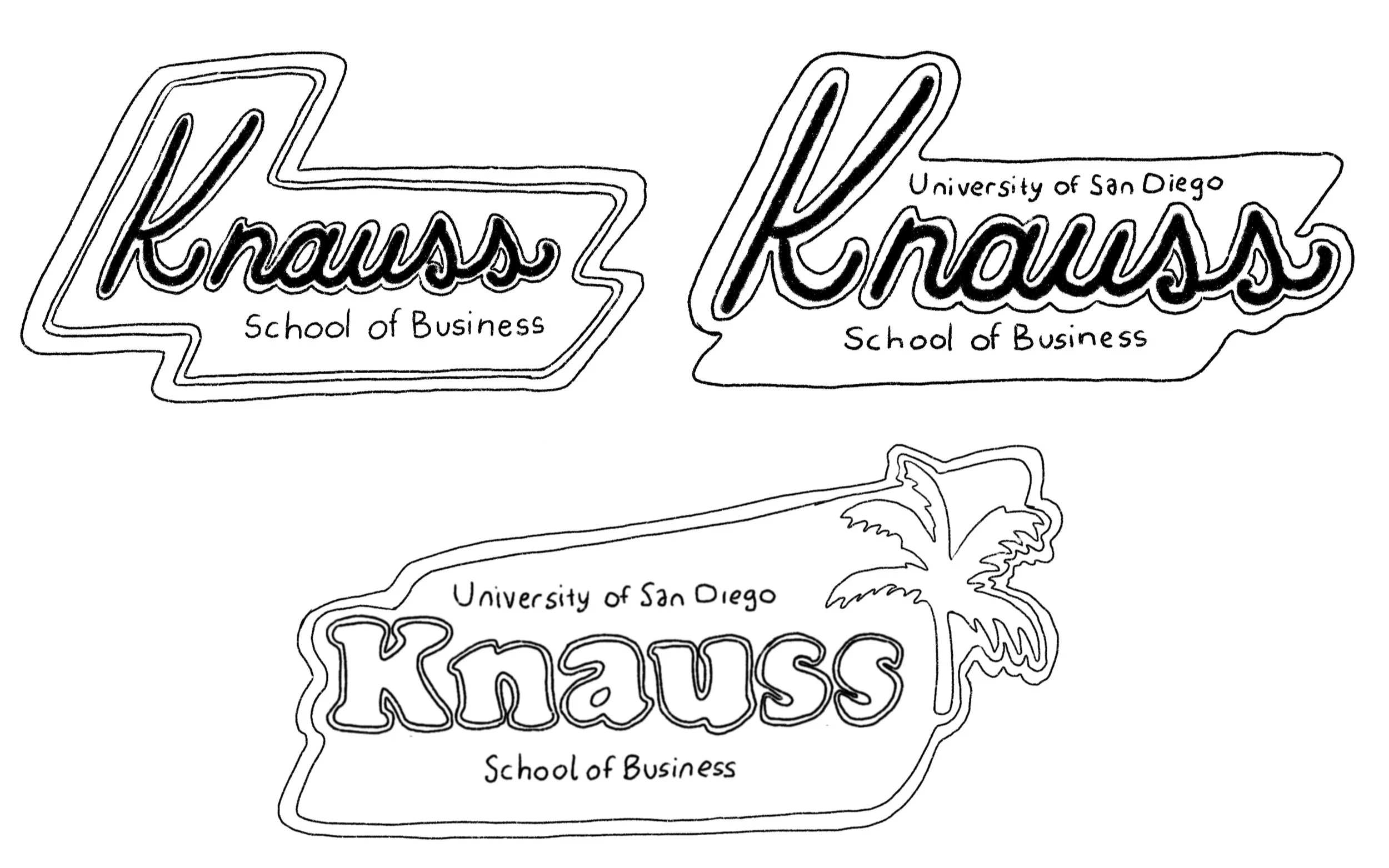 A lot of the proposed sticker designs used the traditional block lettering. “Knauss” is the main focus in big block letters, as opposed to “USD.” This sticker incorporated the beach vibes of San Diego.